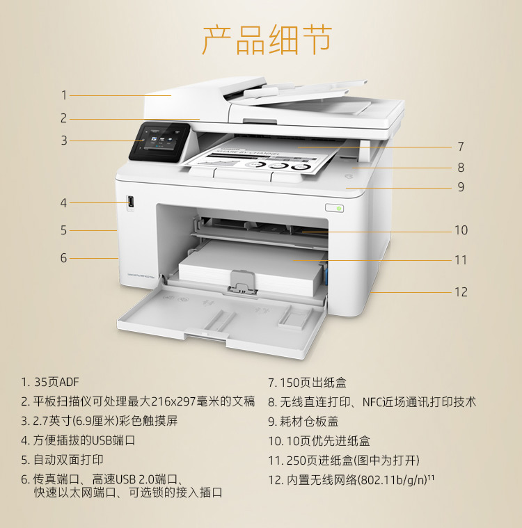 商品名称:惠普(HP)M227fdw四合一无线黑白激光一体机QQ无线物联(打印、复印、扫描、传真、自动双面打印)