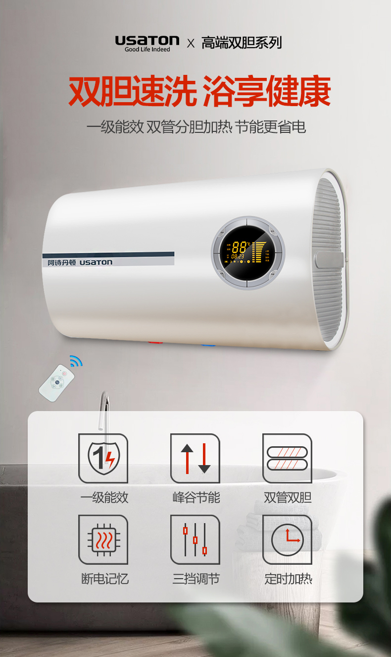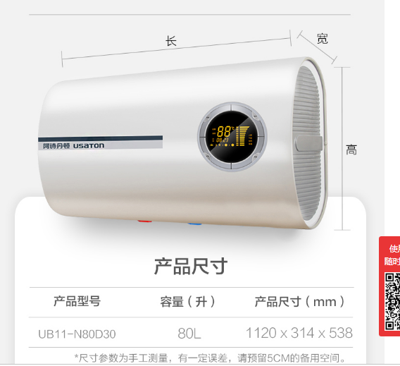 商品名称:阿诗丹顿80升储水式速电热水器 一级能效 扁通双胆热 3000W三挡调节 UB11-N80D30