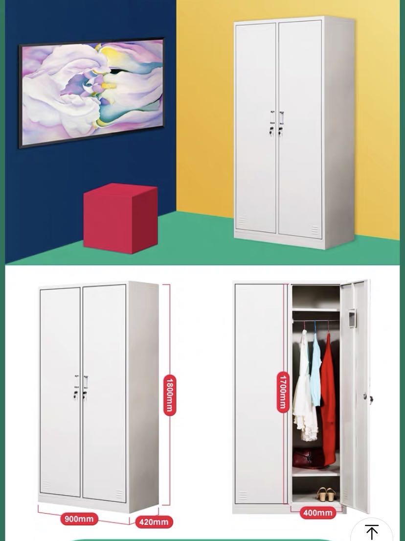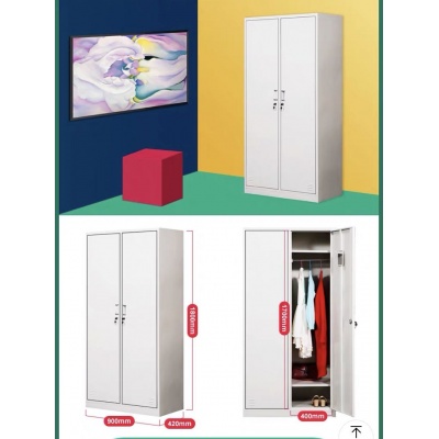 3、结构:对开铁门,门内二层可调节隔板,带挂衣杆,带镜子;边框采用薄边成型后30mm厚,中间层板成型后30mm,成型后美观精致 ;