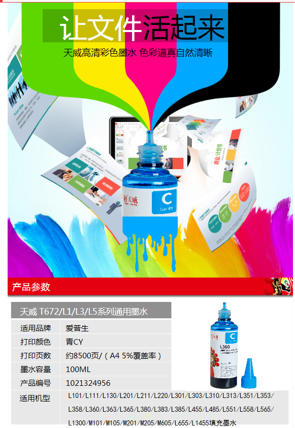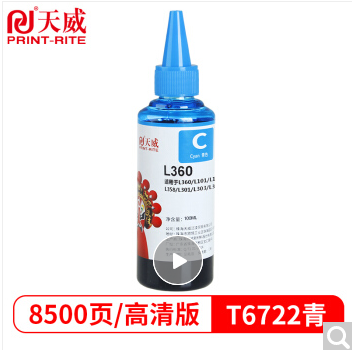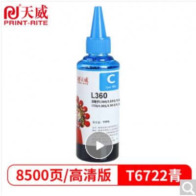 天威 672墨水 适用爱普生EPSON L310 L380 L313 L130 L383 L1300 L363 L565 M105墨仓式打印机 T6722青色高清