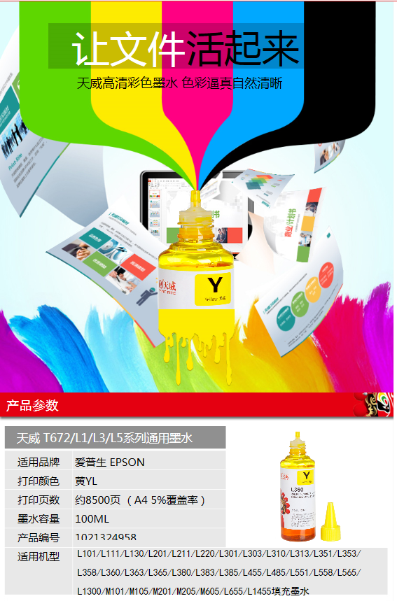 天威 672墨水 适用爱普生EPSON L360 L310 L380 L383 L130 L1300 L566 M101 L551墨仓式打印机 T6724黄色高清