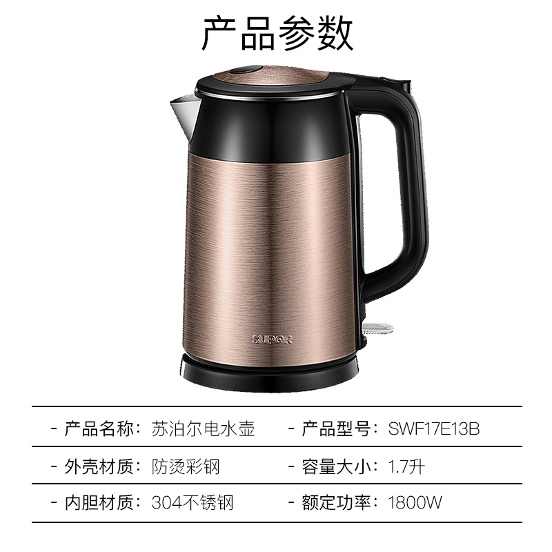 商品名称:苏泊尔(SUPOR)电水壶热水壶 1.7L全钢无缝双层防烫电热水壶 304不锈钢烧水壶