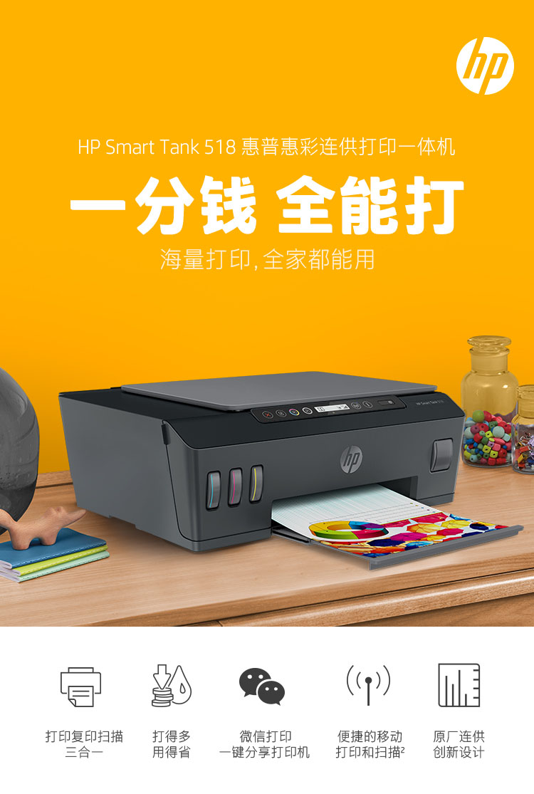 惠普(HP)518 连供无线打印一体机三合一彩色打印复印扫描家庭打印商用办公内置墨仓单页成本1分钱