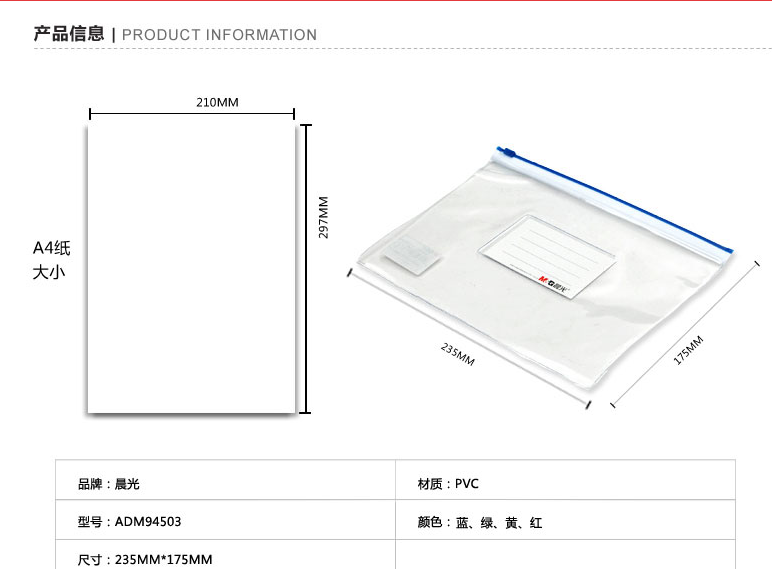 晨光 拉边袋文件袋资料袋A4/A5透明试卷收纳透明PVC拉边袋 资料袋办公彩色文件袋透明塑料拉链 A5(235*175mm)94503 12个/包