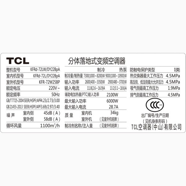 商品名称:TCL KFRd-72LW/DY22BpA 大3匹冷暖变频柜机空调