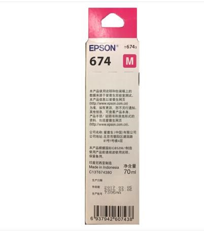 商品名称:爱普生(Epson)T6743洋红色墨水补充装 C13T674380(适用于L801)