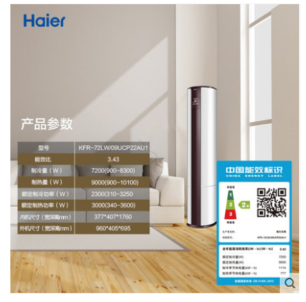 商品名称:Haier/海尔 KFR-72LW/09UCP22AU1 3匹变频除PM2.5自清洁空调柜机