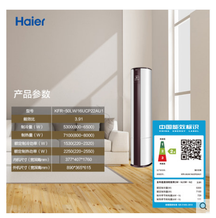 商品名称:Haier/海尔 KFR-50LW/16UCP22AU1 2匹智能变频圆柱空调柜机