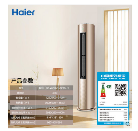 商品名称:Haier/海尔 KFR-72LW/18VCA21AU1 3匹一级能效变频家用空调