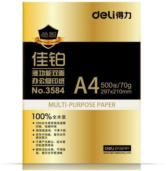 商品名称:得力(deli) 3585A4 佳铂复印纸 70g 500张/包 5包/箱