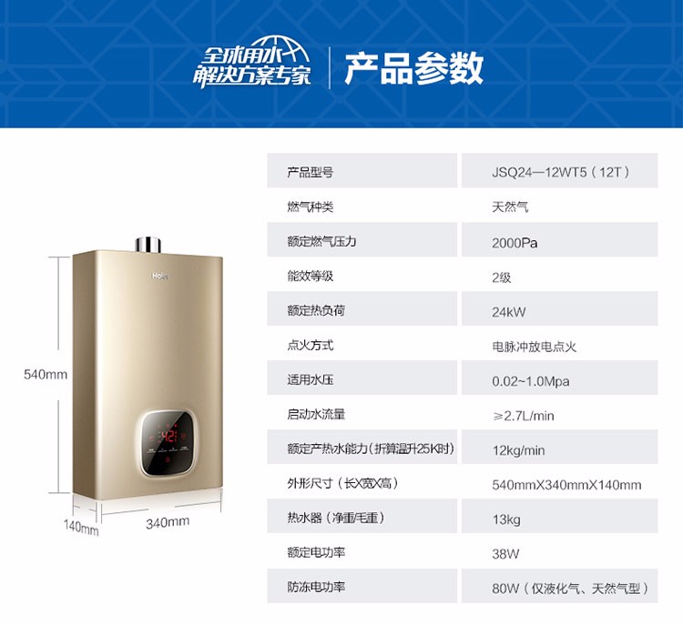 商品名称:Haier/海尔 燃气热水器 JSQ24-12WT5(12T)